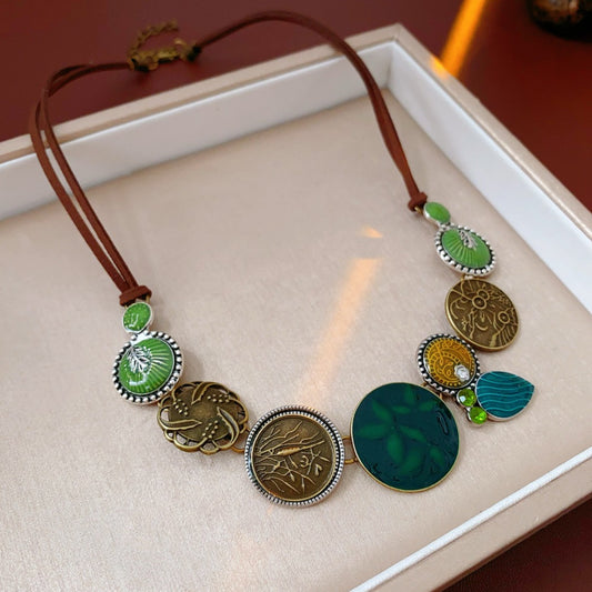 Bauai - Boho Round Bead Necklace with Leaf Charm - Vintage