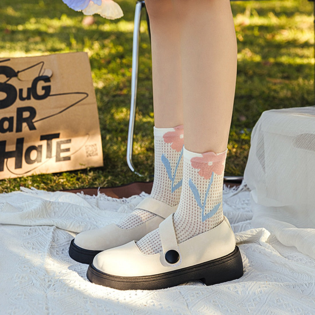 Brighten up your summer with these vibrant tulip-patterned crew socks!